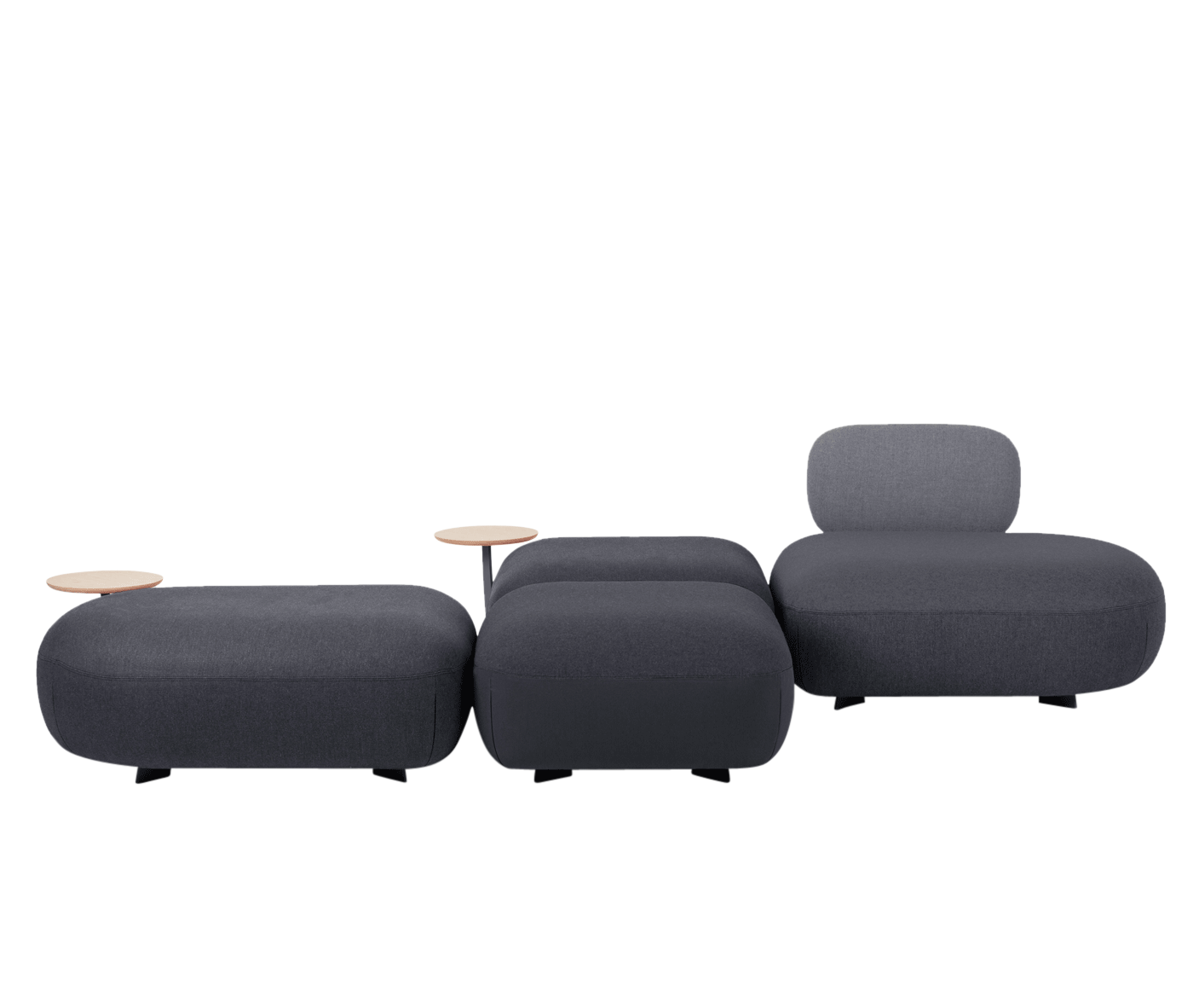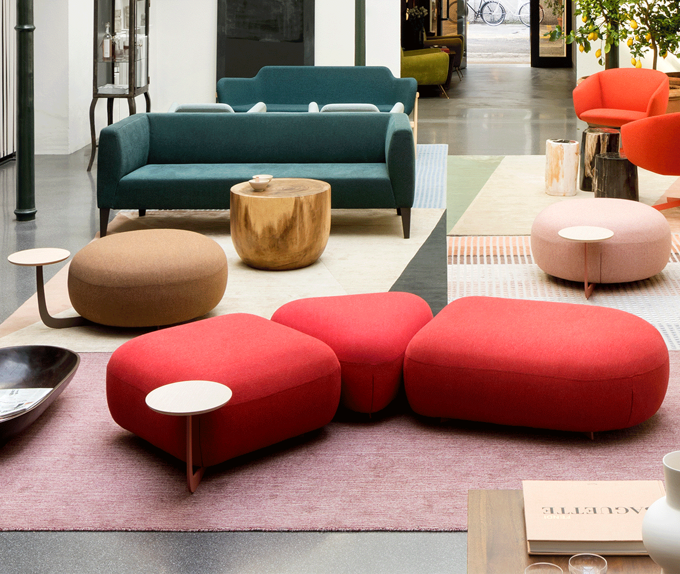 An easy, flexible seating system, suitable for any space thanks to the infinite syntactic possibilities. Code identifies an aesthetic-formal code of simple geometric signs that constitute an alphabet of informal seats: poufs and maxi poufs that are enriched with backs and integrated tables.
