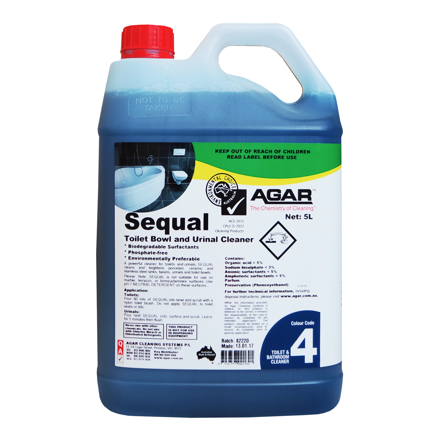 SEQUAL is a thickened, mild-acid cleaner for toilets, urinals, tiled washroom floors, walls, baths, basins and shower recesses. It dissolves all types of deposits from porcelain, ceramic and stainless steel surfaces, and leaves surfaces perfumed with a eucalyptus fragrance.